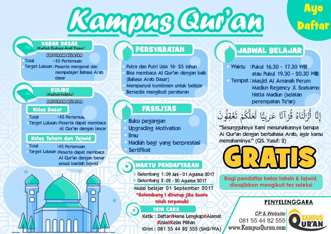 Kami mengucapkan terima kasih kepada semua pihak yg telah mendukung program Kampus Qur’an, rencana awal dari program ini sebenarnya cukup sederhana. Kampus di madiun yg lumayan banyak menjadi daya tarik tersendiri dari sudut pandang dakwah islamiyah, ada keinginan sederhana dr kami bagaimana mahasiwa2 di kampus tersebut jg memperhatikan agama mereka. Kami mengucapkan terima kasih kepada semua pihak yg telah mendukung program Kampus Qur’an, rencana awal dari program ini sebenarnya cukup sederhana. Kampus di madiun yg lumayan banyak menjadi daya tarik tersendiri dari sudut pandang dakwah islamiyah, ada keinginan sederhana dr kami bagaimana mahasiwa2 di kampus tersebut jg memperhatikan agama mereka. Bagaimana mereka selain belajar ilmu di kampus harapannya mereka jg mampu membaca alquran.