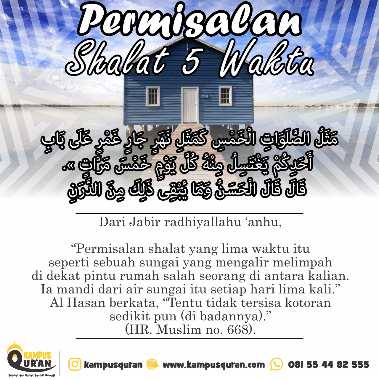 “Permisalan shalat yang lima waktu itu seperti sebuah sungai yang mengalir melimpah di dekat pintu rumah salah seorang di antara kalian. Ia mandi dari air sungai itu setiap hari lima kali.” Al Hasan berkata, “Tentu tidak tersisa kotoran sedikit pun (di badannya).” (HR. Muslim no. 668).